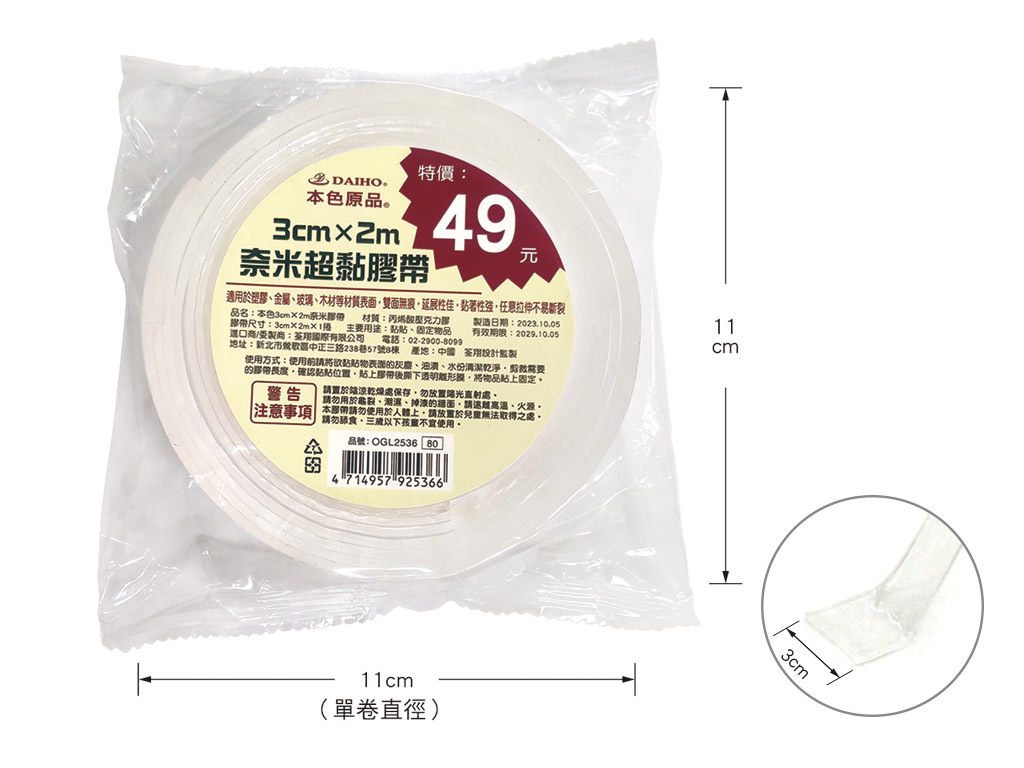 筌翔國際文具禮品-專業設計製作生產行銷批發零售供應商 -- 本色3cm*2M奈米膠帶